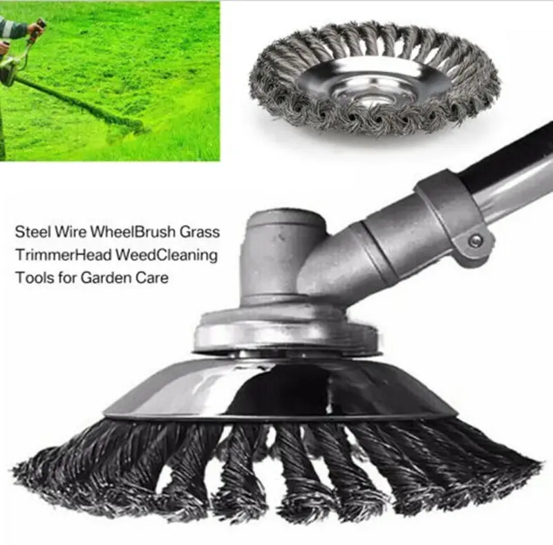 Features a circular array of tightly wound steel cables that aggressively cut through grass, weeds, moss, and even surface rust without damaging solid surfaces like concrete or stone.